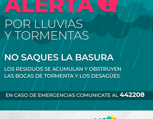 El Gobierno Municipal, a través de la Secretaría de Planeamientos, Obras y Servicios Públicos y Ambiente en conjunto con Defensa Civil informan que se han dado instrucciones a las distintas áreas del municipio para prever consecuencias de las lluvias pronosticadas para estos días, por lo cual se solicita a todos los vecinos prevenir dicha situación.