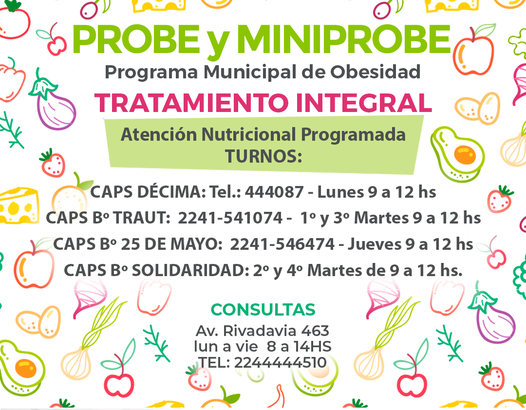 La Dirección de Nutrición, a cargo de la Lic. Natalia Sallette comunica los días y horarios de Atención Nutricional PROBE Y MINIPROBE en los CAPS.