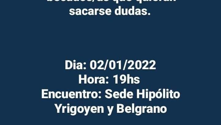 La reunión se llevara a cabo este Domingo 02/01 a las 19hs en nuestra sede ubicada en Hipolito Yrigoyen y Belgrano.