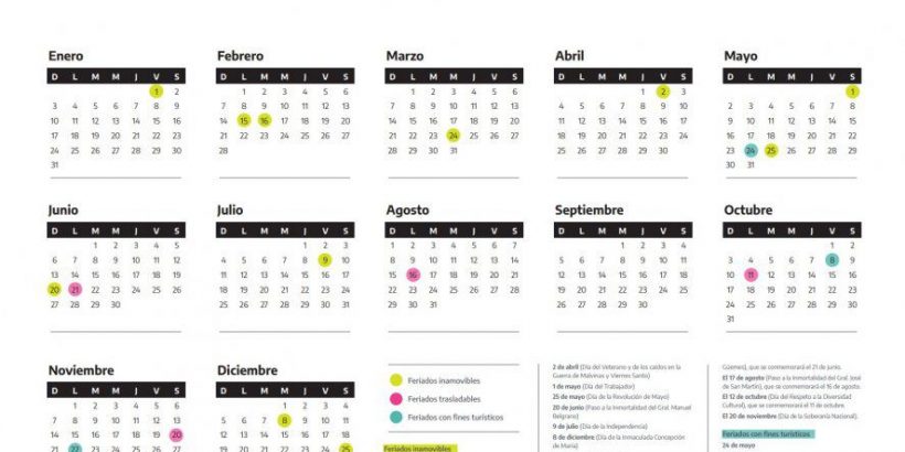 En tanto, los feriados trasladables serán el 17 de junio (Paso a la Inmortalidad del Gral. Güemes), que se conmemorará el 21 de junio, el 17 de agosto (Paso a la Inmortalidad del Gral. José de San Martín), que se conmemorará el 16 de agosto, el 12 de octubre (Día del Respeto a la Diversidad Cultural), que se conmemorará el 11 de octubre y el 20 de noviembre (Día de la Soberanía Nacional). Por su parte, los feriados con fines turísticos, serán el 24 de mayo, 8 de octubre y el 22 de noviembre.