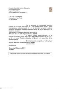 Dirección General de Cultura y Educación Pcia. De Buenos Aires Región 24-Las Flores Escuela de Educación Secundaria Nº1A las Flias y Estudiantes Ingresantes a 1er año de Ed . SecundariaPor la presente la Comunidad educativa Escuela de Educación Secundaria Nº 1 “Del Pueblo de Las Flores”, quiere informarles que entre los días 9, 10 y 11 de diciembre se llevará a cabo la inscripción a distancia-llamados telefónicos-envío de msj de whtsapp-a los siguientes celulares:*TM de 8 a 12-Preceptora Mercedes Dahn 476720*T.T de 13. 30 a 17.30 Pr. Agustina Muñoz-465067Y podrán hacerlo presencialmente, en el domicilio escolar Av Carmen 766; el día Lunes 14/12 en horarios de: 10 a 12 y de 15 a 18 horas. También miércoles16/12de 8 a 12 y de 15 a 18 hs. respectivamente.En ningún caso la inscripción por orden y/o por horarios, determina la matriculación por turnos. Los esperamos. Cordialmente Comunidad Educativa EES 110/12/20