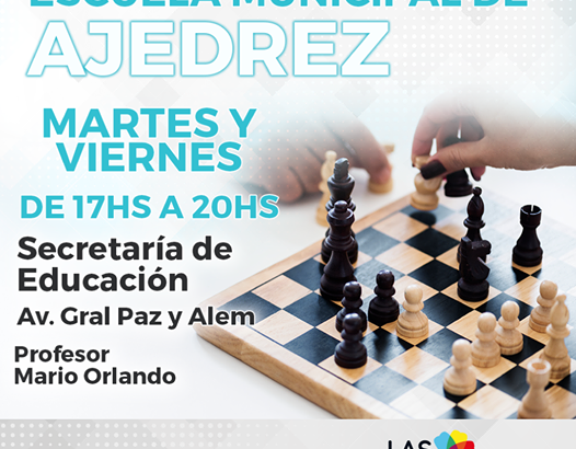 La Secretaría de Deportes Municipal comunica a todos los interesados que la Escuela Municipal de Ajedrez, a cargo del Prof. Mario Orlando, dictará clases de ajedrez los días martes y viernes, de 17 a 20 h, en la sede de la Secretaría de Educación, en Avda. General Paz y Alem.