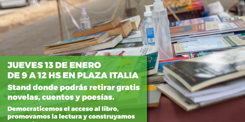 La Secretaría de Educación y la Biblioteca Municipal Dr. Pablo Minellono informan a la comunidad que hoy 13 de enero, de 9 a 12 horas, en la Plaza Italia, estará el stand del que se podrán retirar gratuitamente novelas, cuentos y poesías.