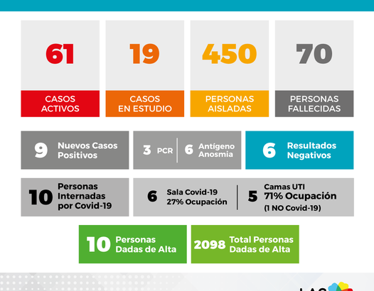 En el día de hoy ingresaron nuevos resultados, arrojando 9 positivos. 3 por medio de hisopados PCR y 6 por test de antígeno, anosmia y 6 resultados negativos.