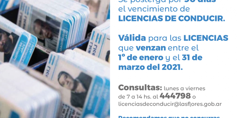 Por Disposición Nº 64/2020, el Gobierno de la Provincia de Buenos Aires a través de la Dirección Provincial de Política y Seguridad Vial, prorroga los vencimientos de las Licencias Nacionales de Conducir que operen entre el 01/01/2021 y el 31/03/2021, por el término de 90 (noventa) días corridos, contados a partir de la fecha original impresa en los respectivos vencimientos.