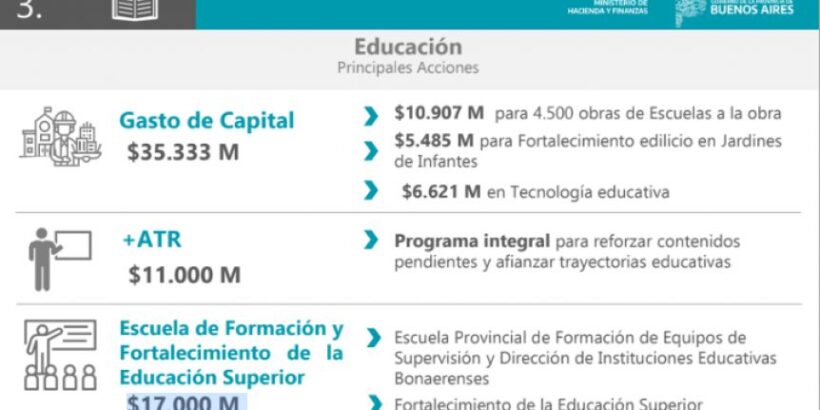 Sobre el programa ATR, se destinarán $11.000 M al Programa integral para reforzar contenidos pendientes y afianzar trayectorias educativas. Asimismo, para la Escuela de Formación y Fortalecimiento de la Educación Superior se destinarán $17.000 M.