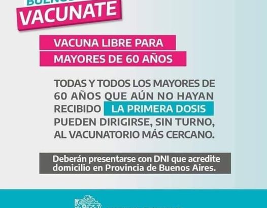 La Secretaría de Salud Pública comunica que, desde mañana, sábado 12 de junio, hay modalidad de vacunación libre, de la 1º dosis, para todos los mayores de 60 años.