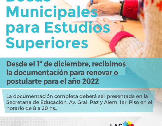 La Secretaría de Educación de la Municipalidad de Las Flores informa a los beneficiarios y a aquellos interesados en acceder a las Becas Municipales económicas y habitacionales para Estudios Superiores que desde el 1º de diciembre, se recibe la documentación para renovar o postularse a dichas becas para el año 2022.