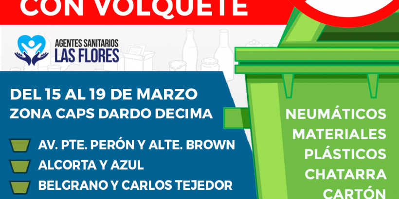 La Secretaría de Salud Pública comunica que desde hoy y hasta el viernes 19 de marzo inclusive, los volquetes estarán ubicados en la zona del CAPS Dardo Décima, en las siguientes calles: Av. Pte. Perón y Alte. Brown, Alcorta y Azul y Belgrano y Carlos Tejedor.