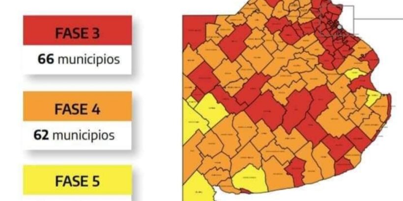 En tanto, en fase 4 hay un total de 62 municipios y solamente 7 localidades se encuentran en fase 5, sin que se registren municipios que hayan mejorado su situación en la última semana.