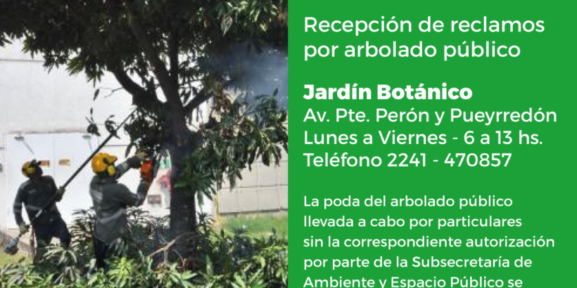 La oficina de recepción de los reclamos de arbolado público funciona en el espacio correspondiente al Jardín Botánico, en Av. Pte. Perón y Pueyrredón, de lunes a viernes, en el horario de 6 a 13, o por teléfono al 2241 – 470857.