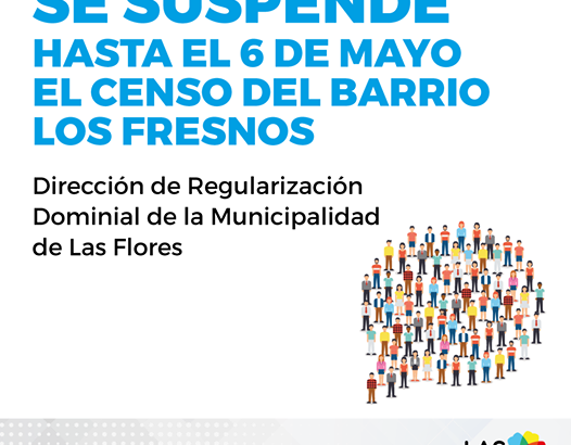 La Dirección de Regularización Dominial de la Municipalidad de Las Flores, comunica a los vecinos del Barrio Los Fresnos, que el censo informado por notificación se suspende hasta el 6 mayo, debido a la situación sanitaria provocada por la pandemia del coronavirus que afecta a todo nuestro país y también a nuestra comunidad.